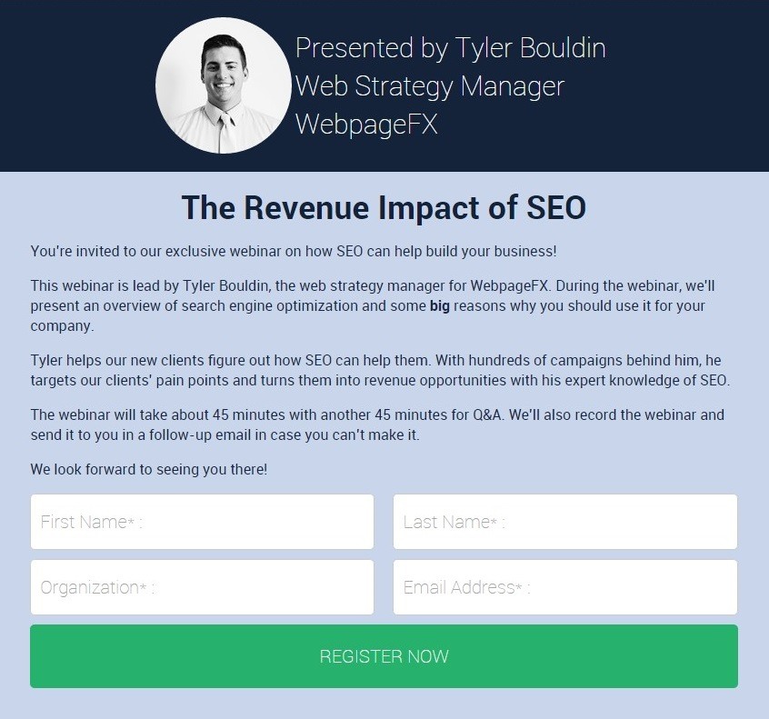 首先创建一个吸引人的登录页面,介绍网络研讨会的主题和演讲者,突出日期和时间,并包括一个明确的行动呼吁人们注册参加。